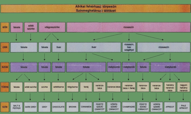 A lenti képen lévő csodaszép chocolate white törpesünin jól megfigyelhető a sötét orr, sötét szem, maszkos arc, színes bőr, míg a tüskéi majdnem fehérek.