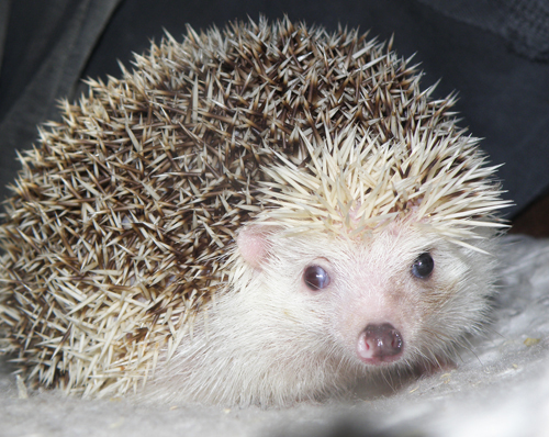 Színpigmenttel nem rendelkező, rózsaszín bőrű és orrú, piros szemű hófehér sün.